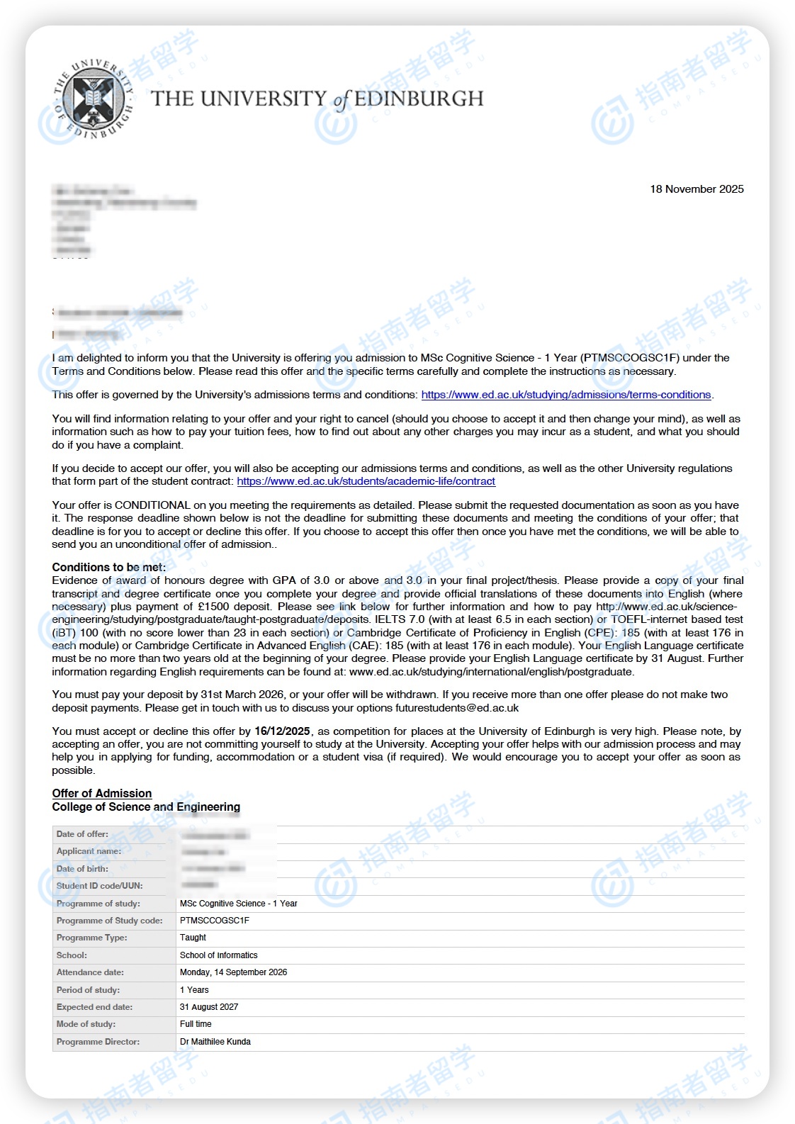 爱丁堡大学认知科学理学硕士研究生offer一枚