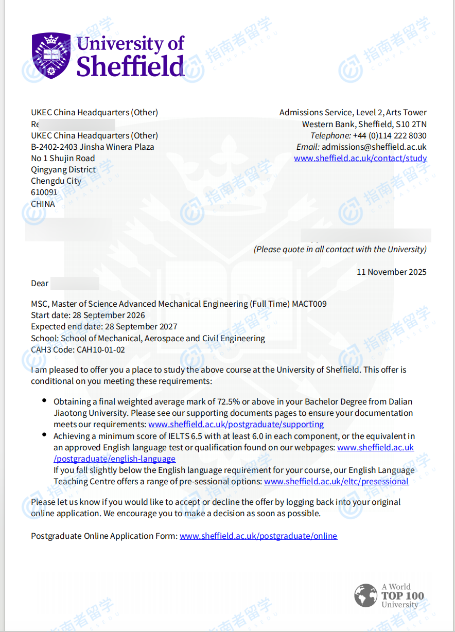 谢菲尔德大学高级机械工程理学硕士研究生offer一枚