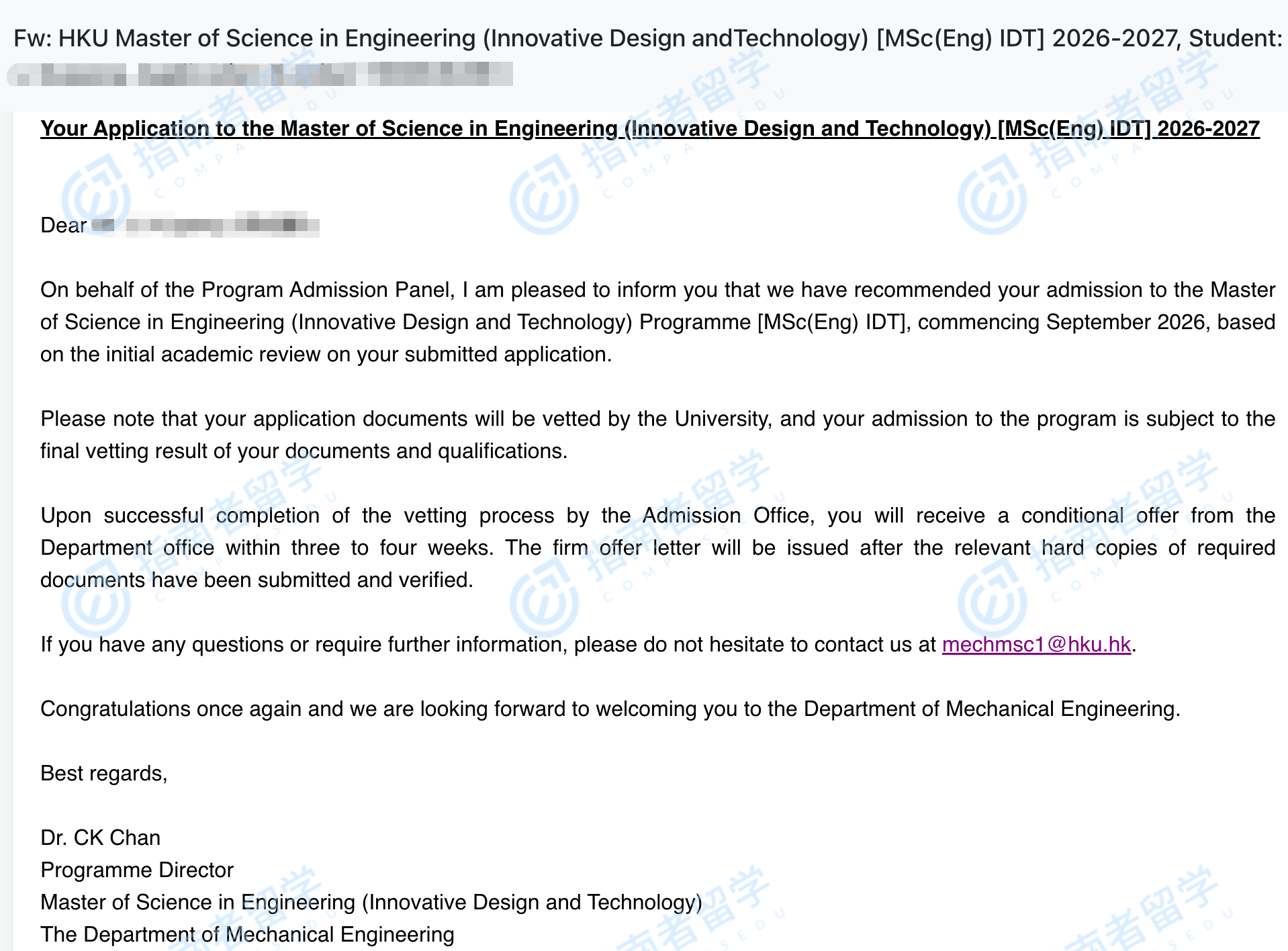 香港大学创新设计与科技(工程)理学硕士研究生offer一枚