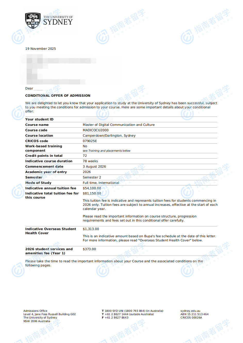 悉尼大学数字传播与文化硕士研究生offer一枚