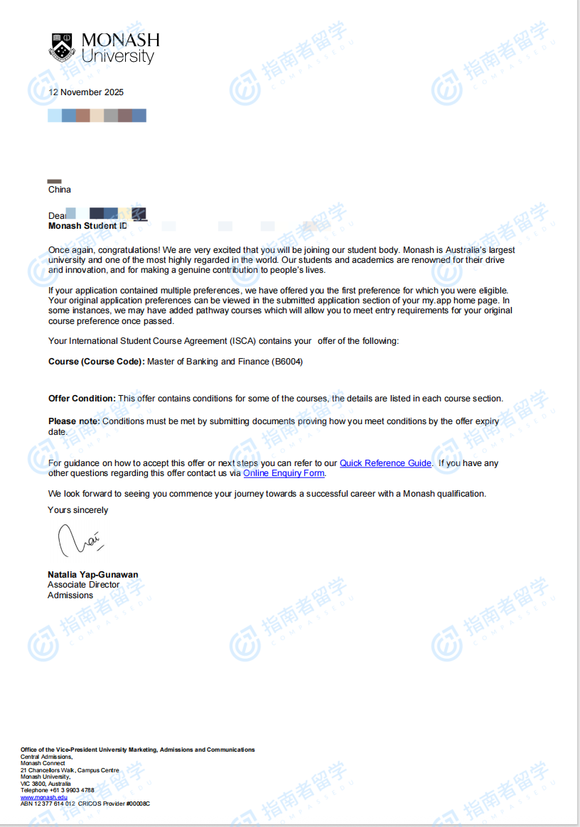 莫纳什大学银行与金融硕士研究生offer一枚