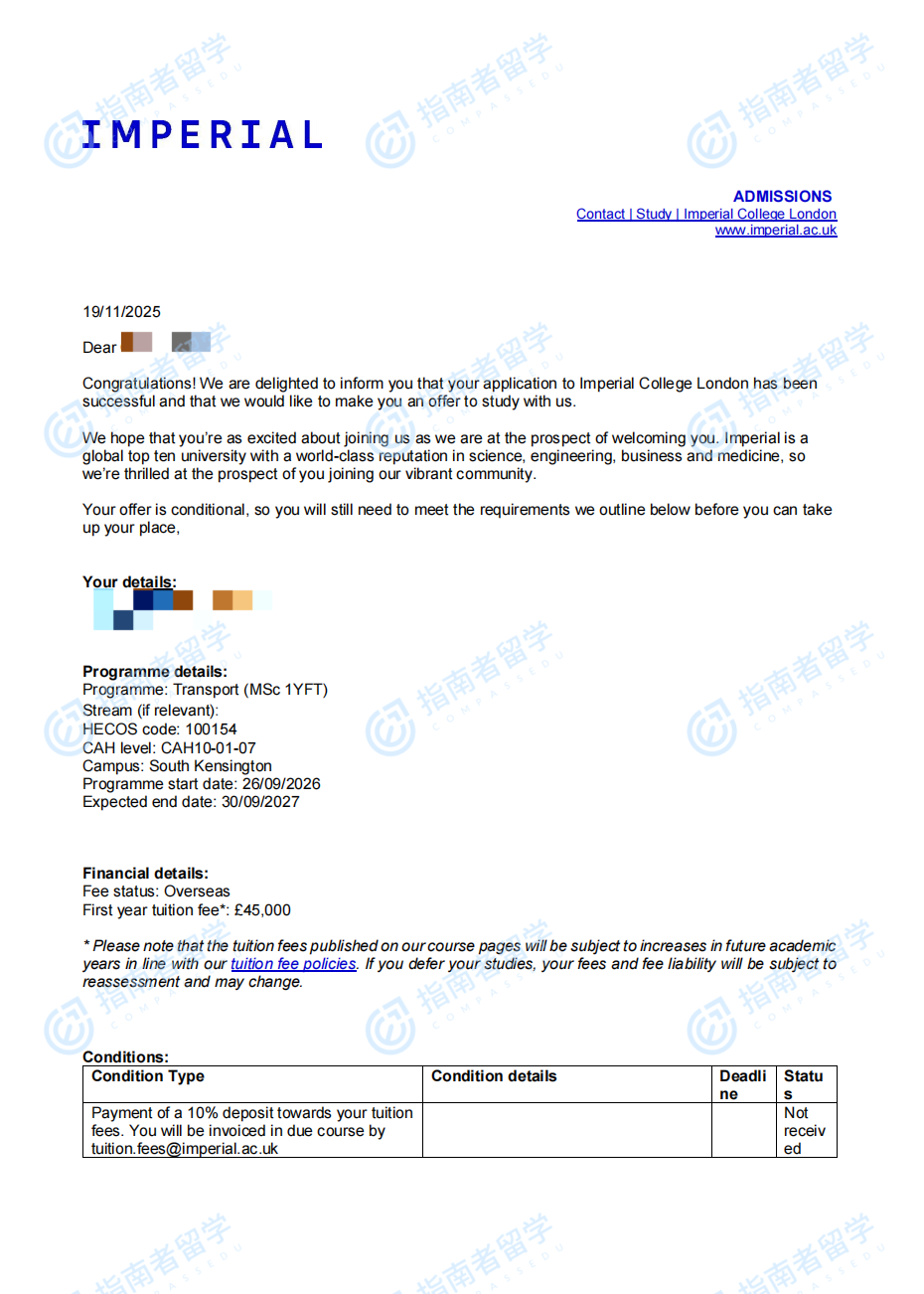 帝国理工学院运输理学硕士研究生offer一枚