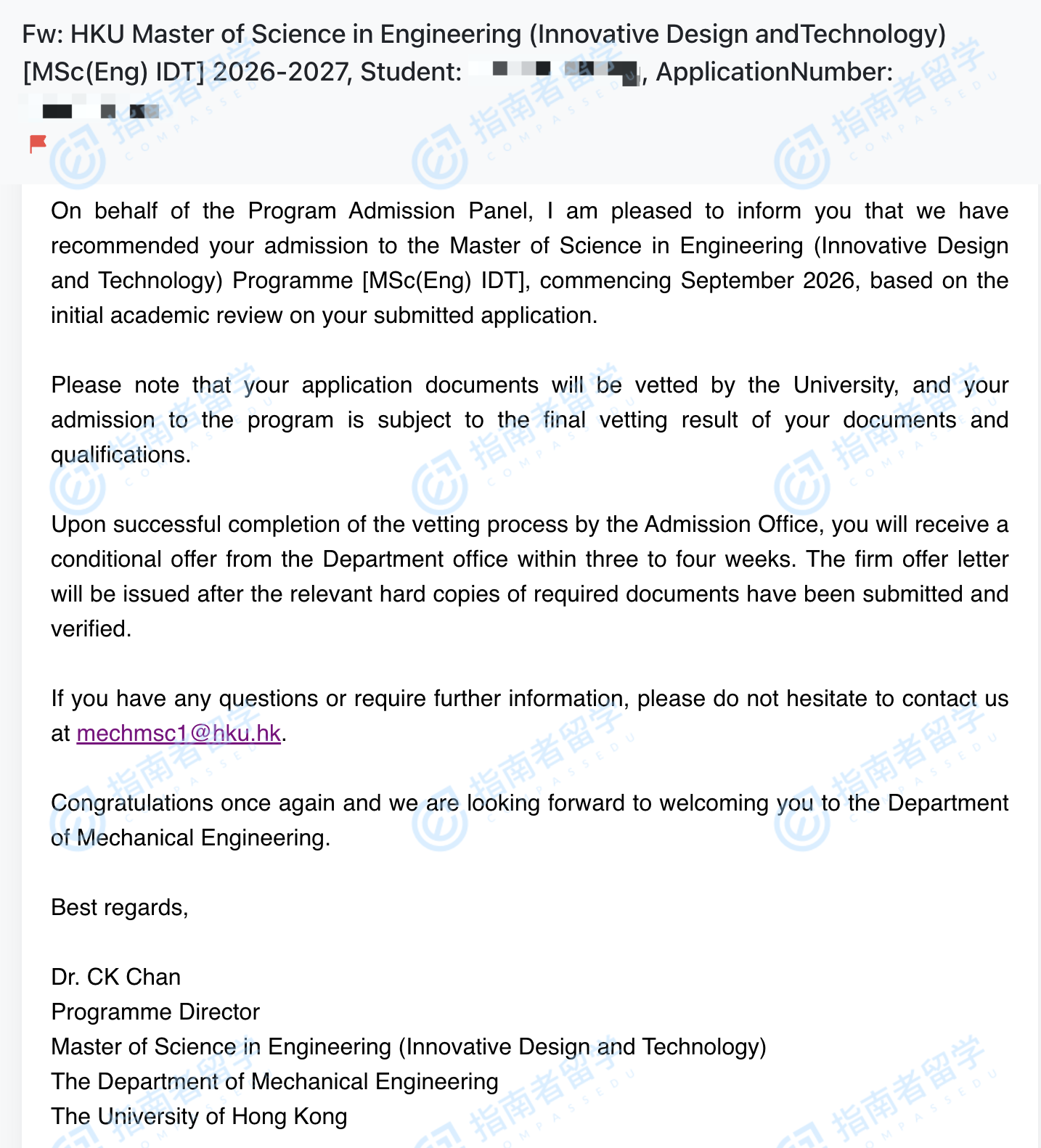 香港大学创新设计与科技(工程)理学硕士研究生offer一枚