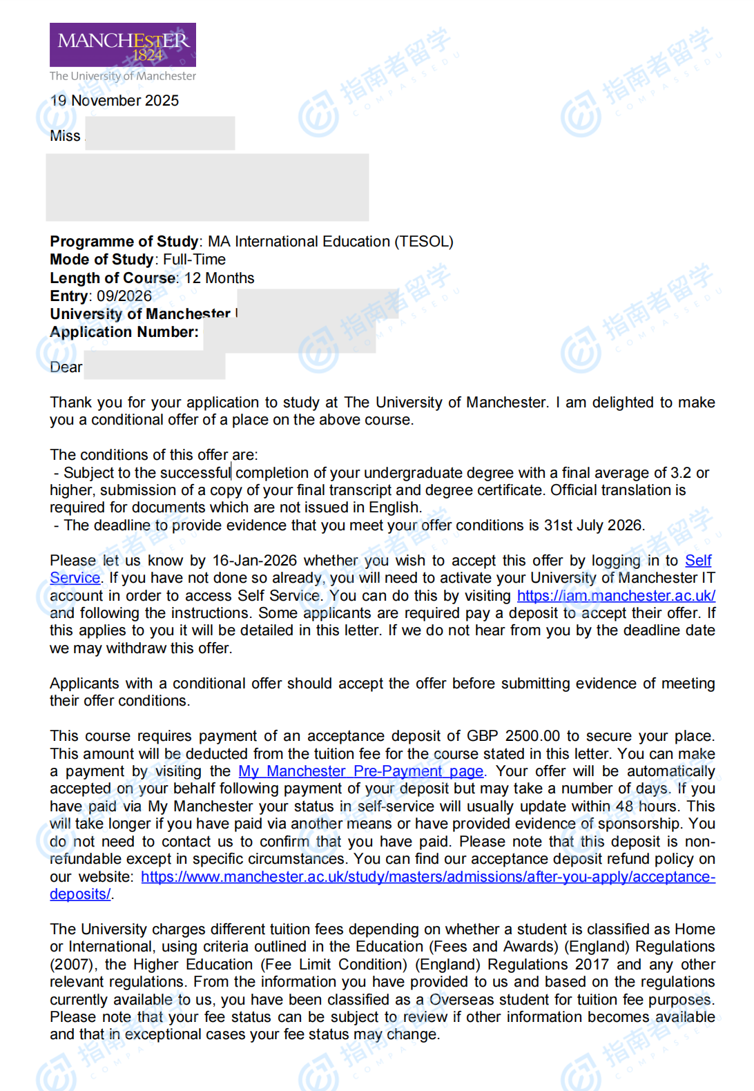 曼彻斯特大学国际教育(对外英语教学)文学硕士研究生offer一枚