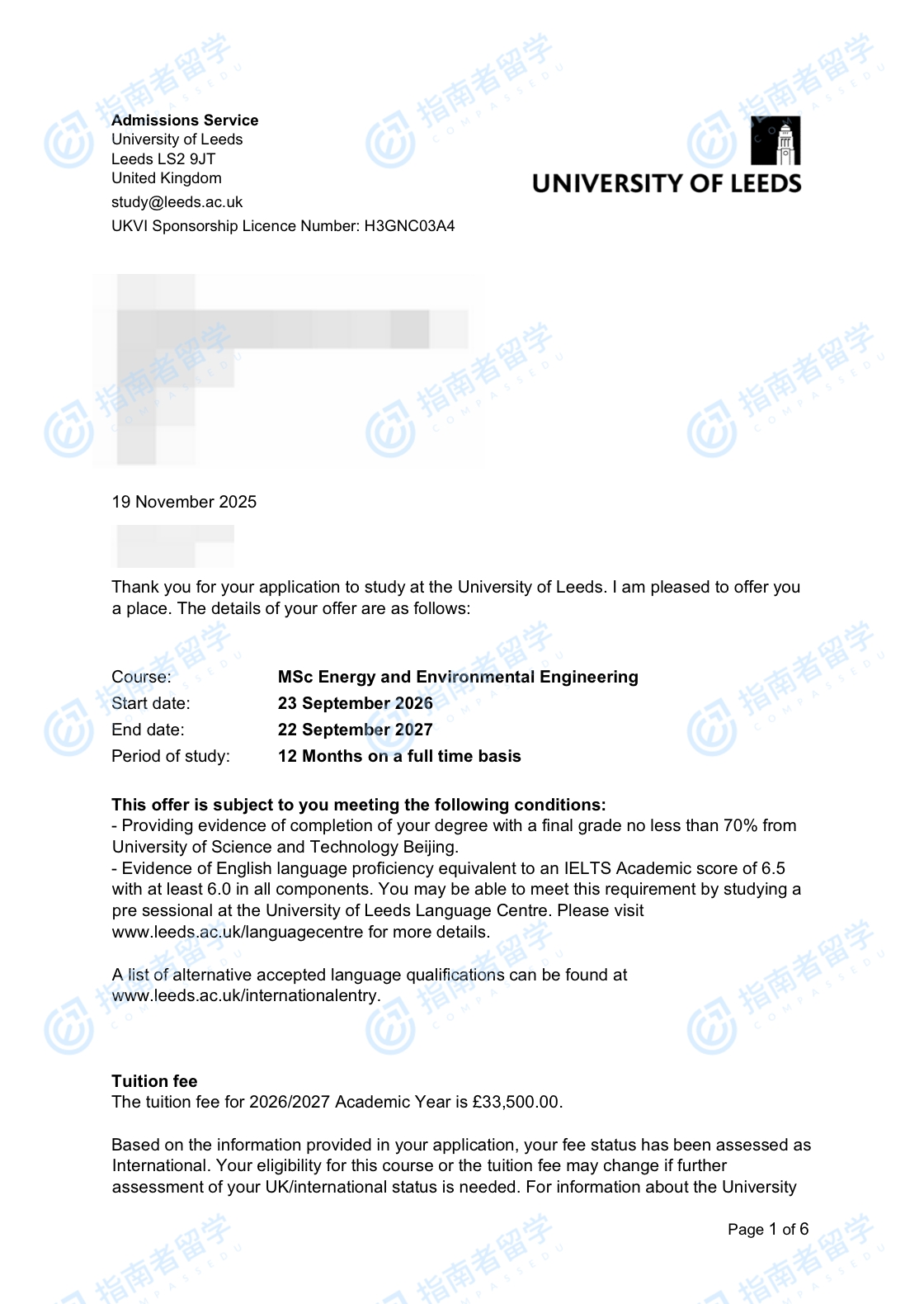 利兹大学能源与环境工程理学硕士研究生offer一枚