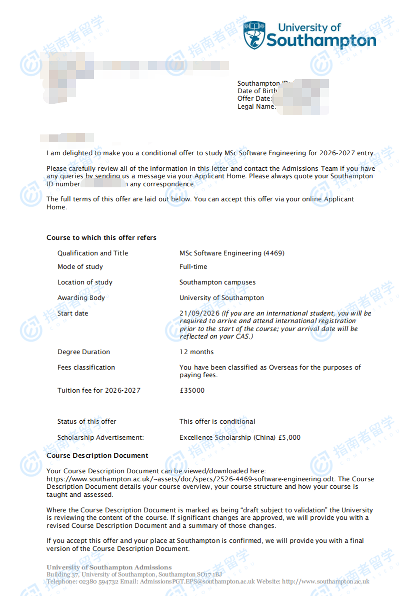 南安普顿大学软件工程理学硕士研究生offer一枚