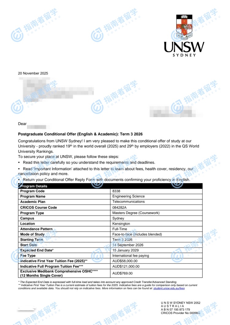 新南威尔士大学工程科学硕士(电信)研究生offer一枚