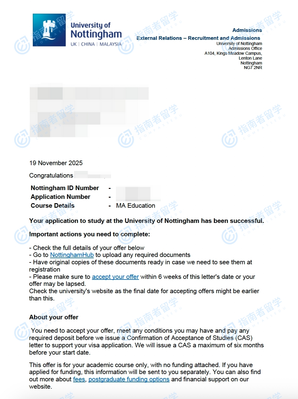 诺丁汉大学教育学文学硕士研究生offer一枚