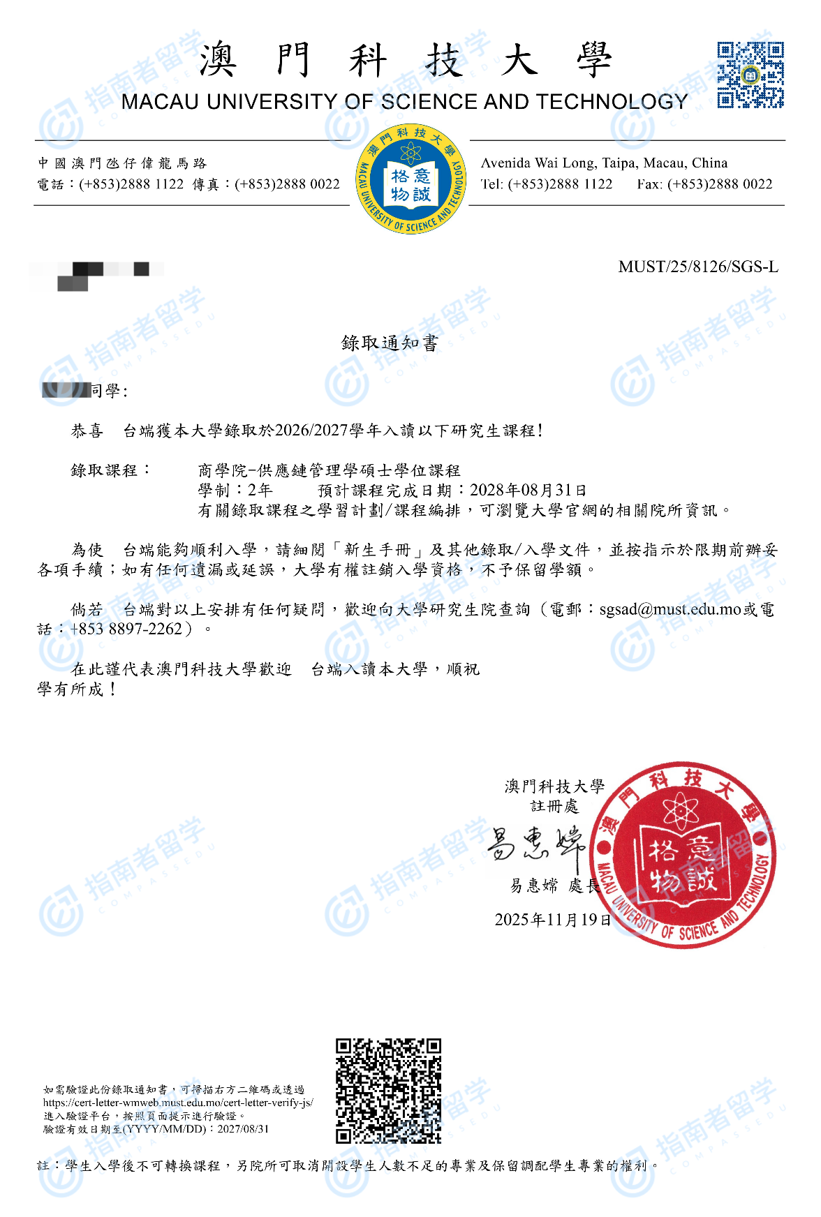 澳门科技大学供应链管理学硕士研究生offer一枚