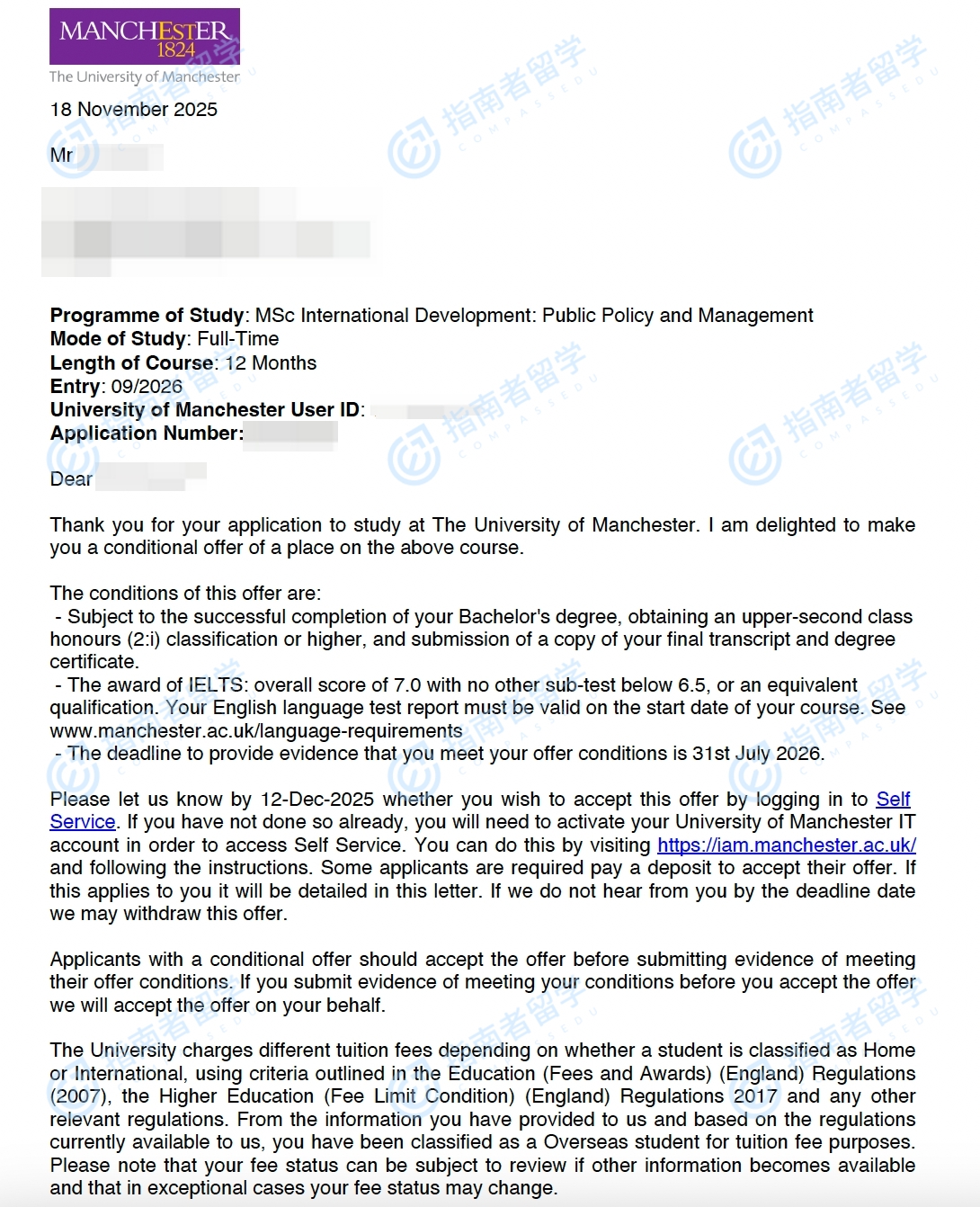 曼彻斯特大学国际发展:公共政策与管理理学硕士研究生offer一枚