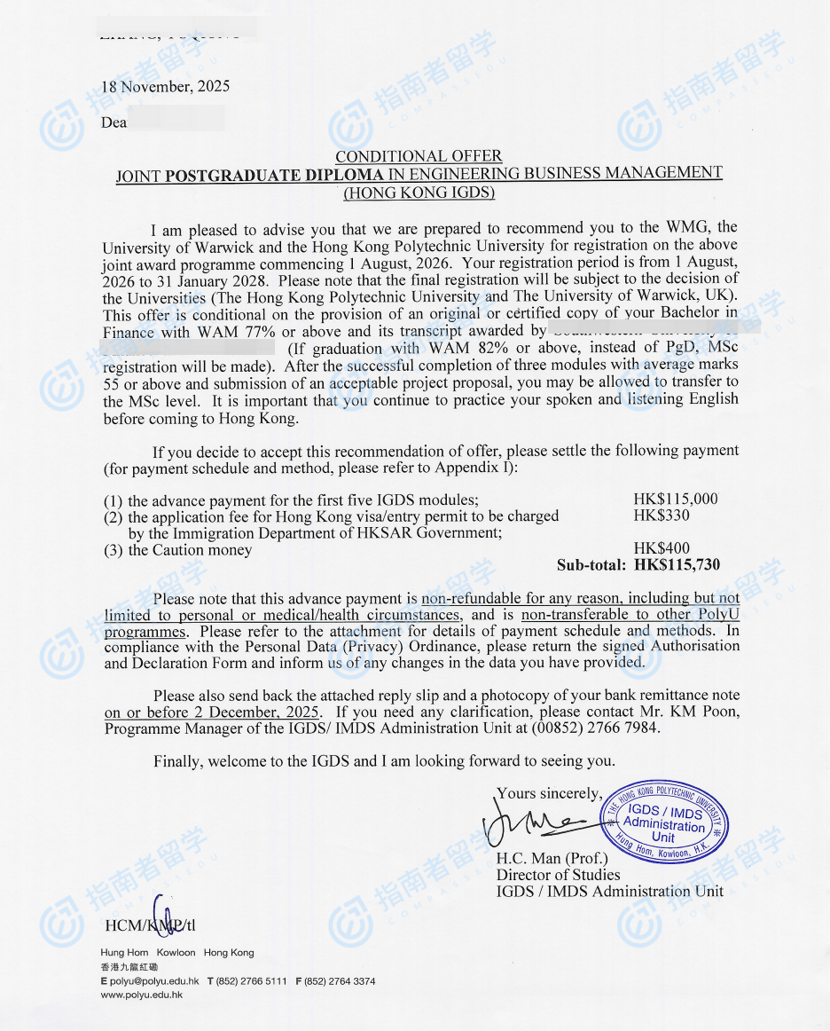 香港理工大学工程商业管理理学硕士研究生offer一枚