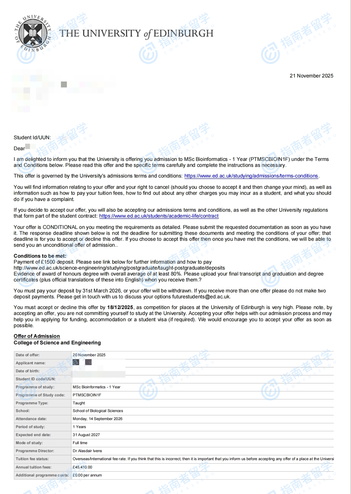 爱丁堡大学生物信息学理学硕士研究生offer一枚