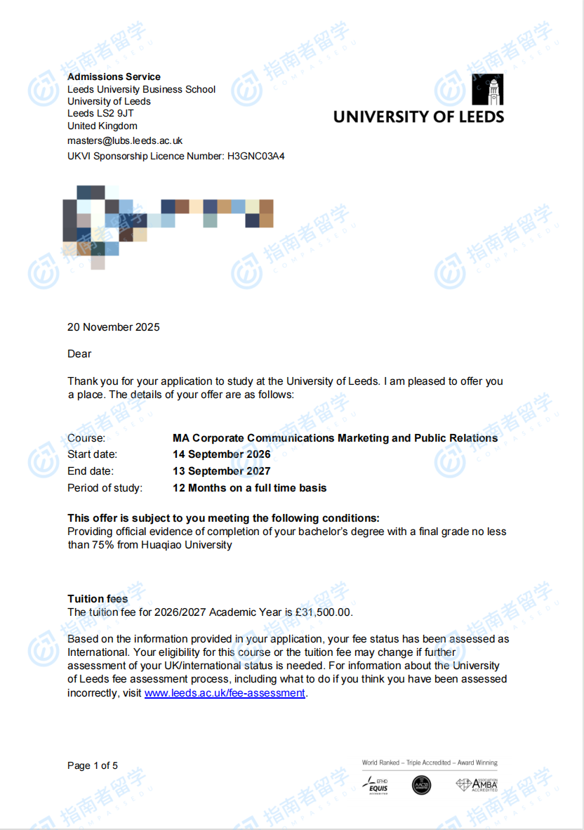 利兹大学企业传播、市场营销与公共关系文学硕士研究生offer一枚