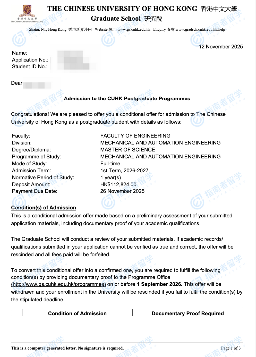 香港中文大学机械与自动化工程理学硕士研究生offer一枚