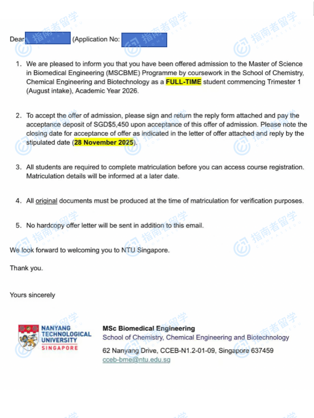 南洋理工大学生物医学工程理学硕士研究生offer一枚