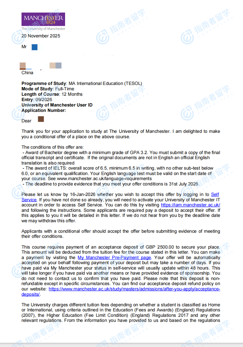 曼彻斯特大学国际教育(对外英语教学)文学硕士研究生offer一枚