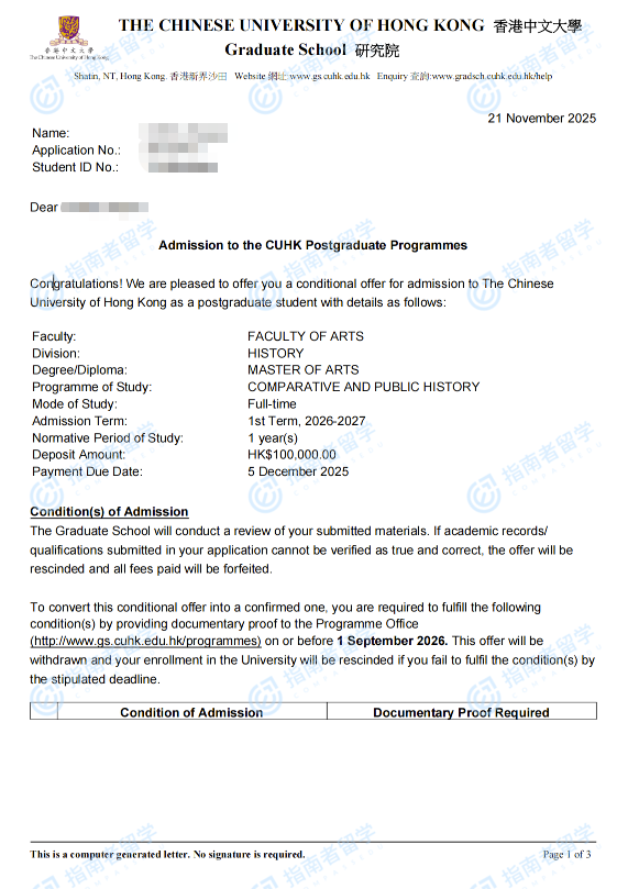 香港中文大学比较及公众历史学文学硕士研究生offer一枚