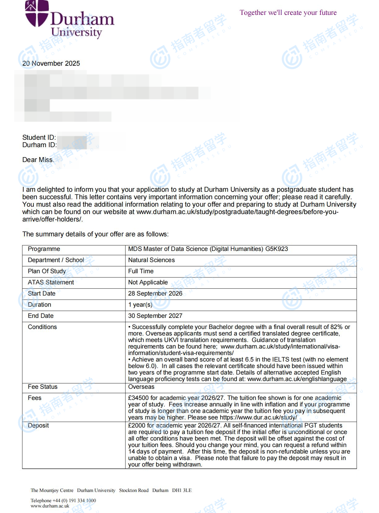 杜伦大学数据科学(数字人文)硕士研究生offer一枚