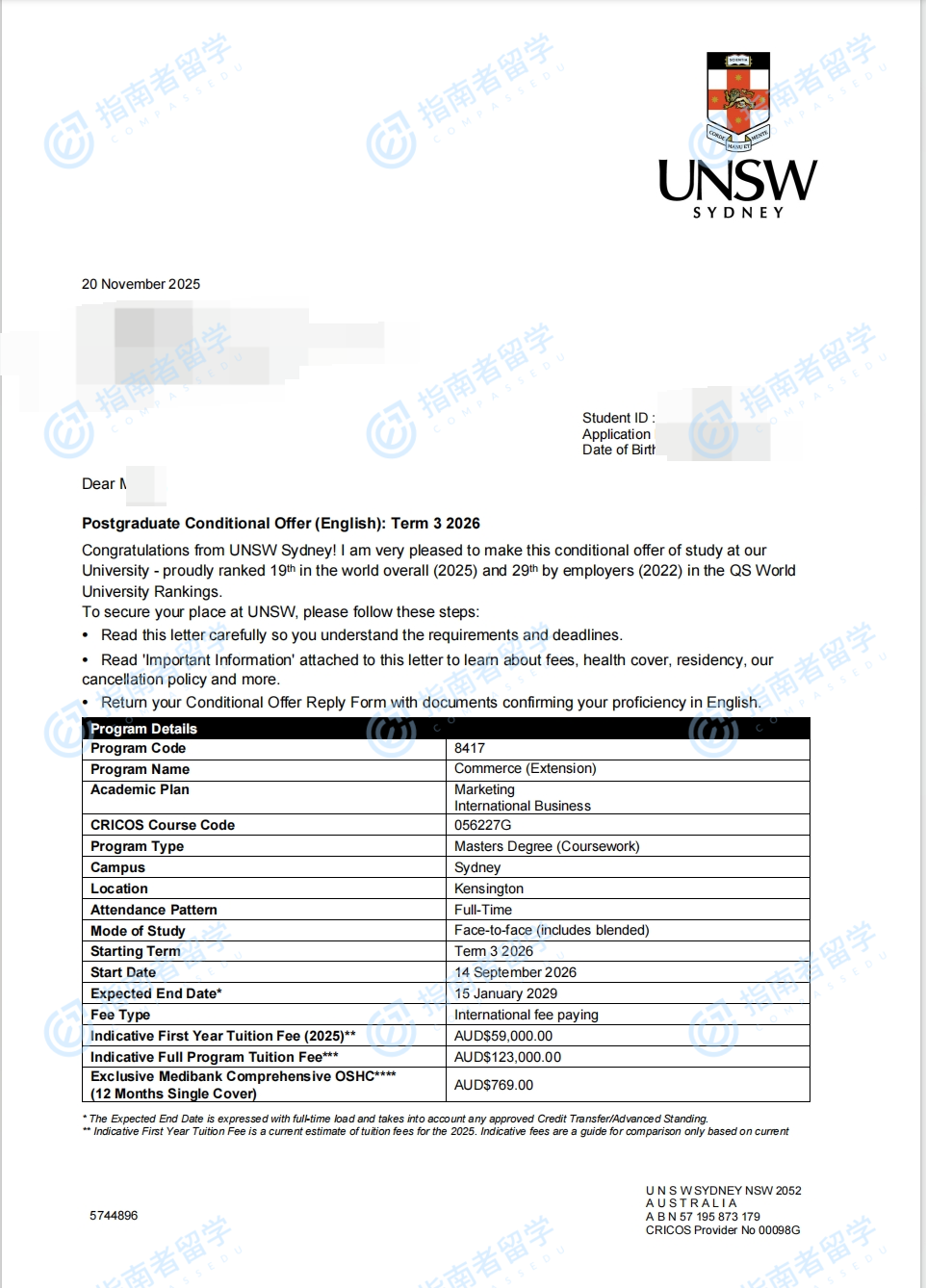 新南威尔士大学商学硕士(扩展课程)研究生offer一枚