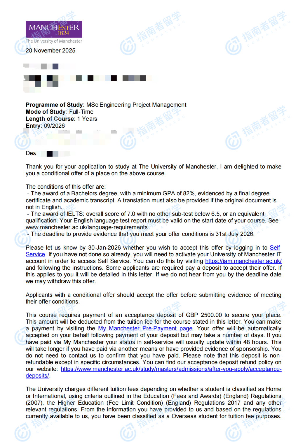 曼彻斯特大学工程项目管理理学硕士研究生offer一枚
