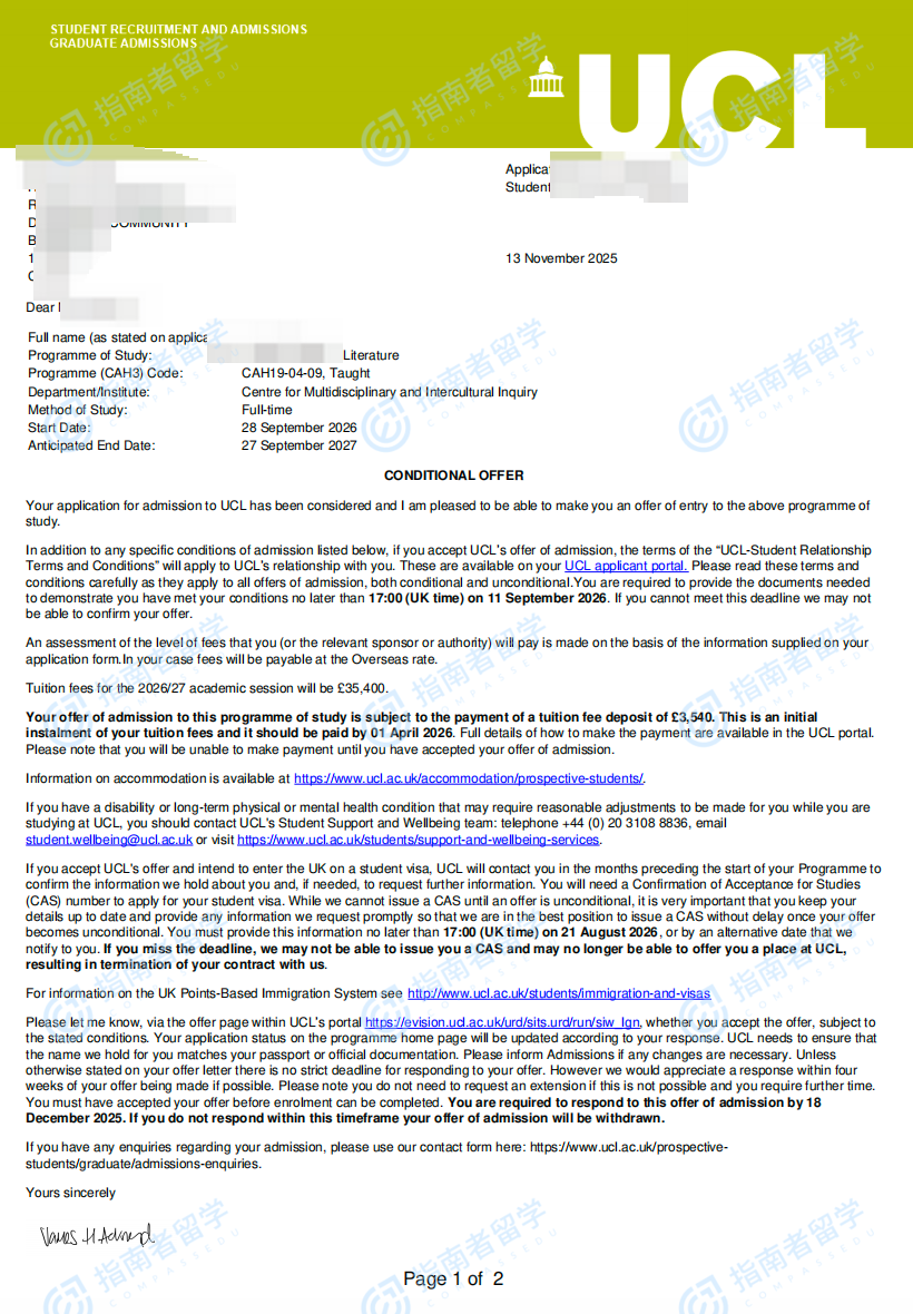 伦敦大学学院比较文学文学硕士研究生offer一枚