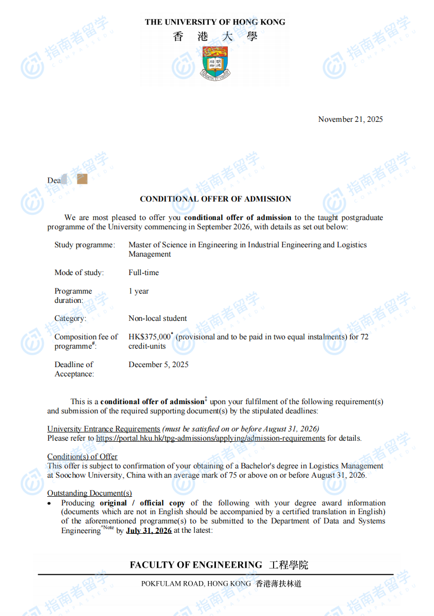 香港大学工业工程与物流管理(工程)理学硕士研究生offer一枚