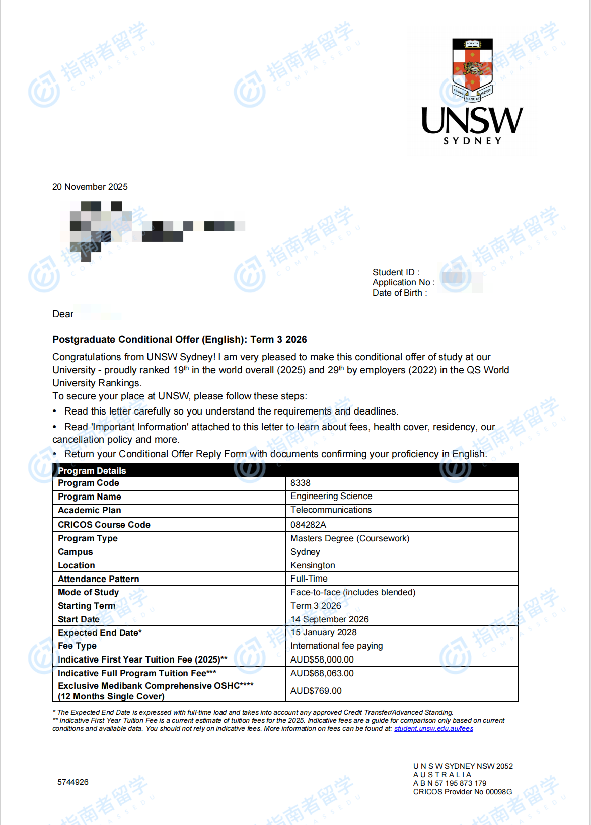 新南威尔士大学工程科学硕士(电信)研究生offer一枚