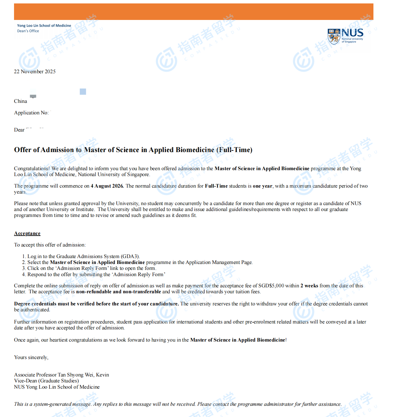 新加坡国立大学应用生物医学理学硕士研究生offer一枚