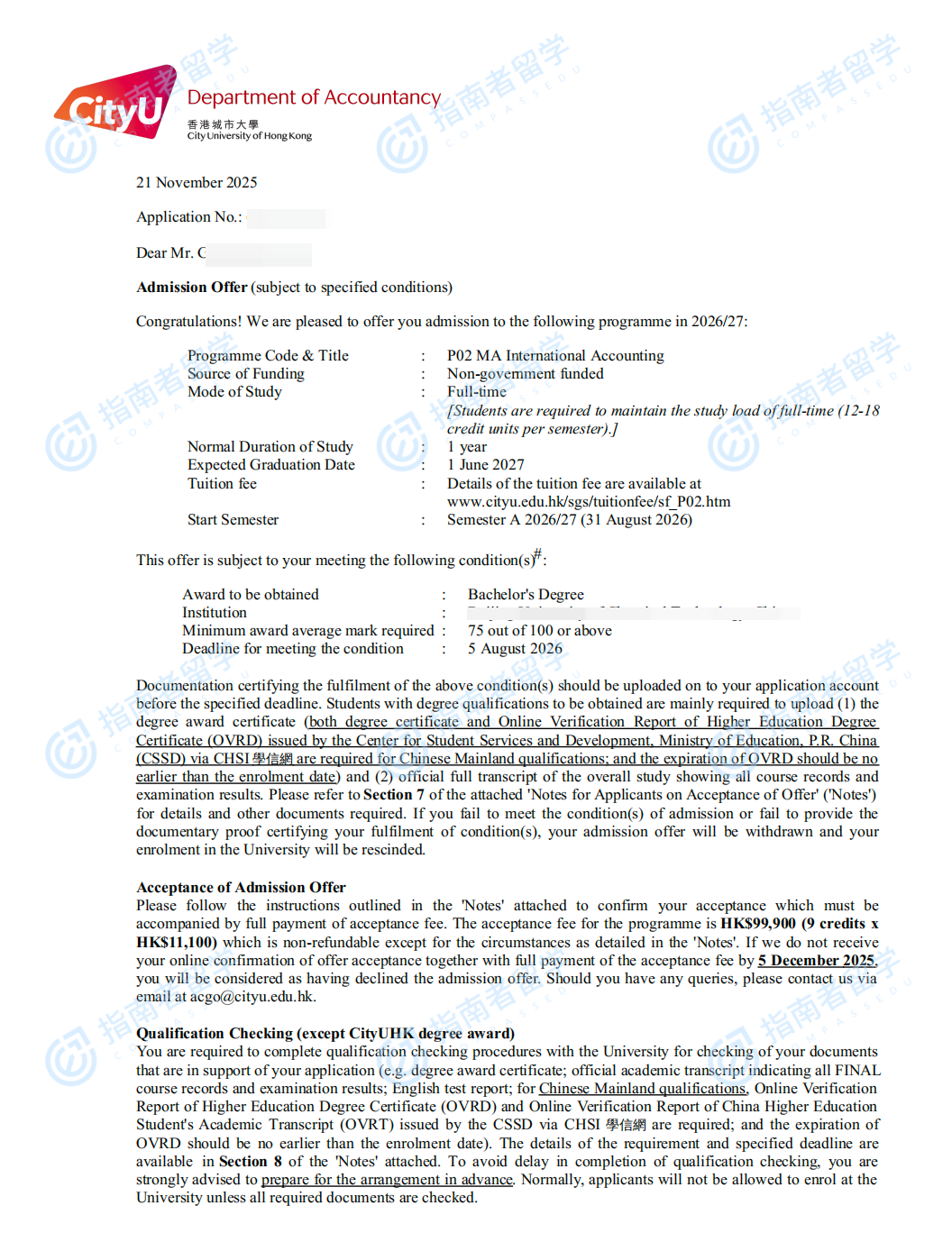 香港城市大学国际会计学文学硕士研究生offer一枚