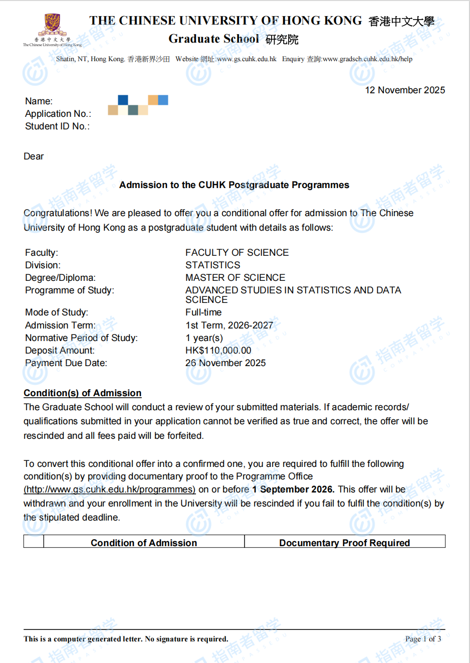 香港中文大学统计与数据科学高级研究理学硕士研究生offer一枚