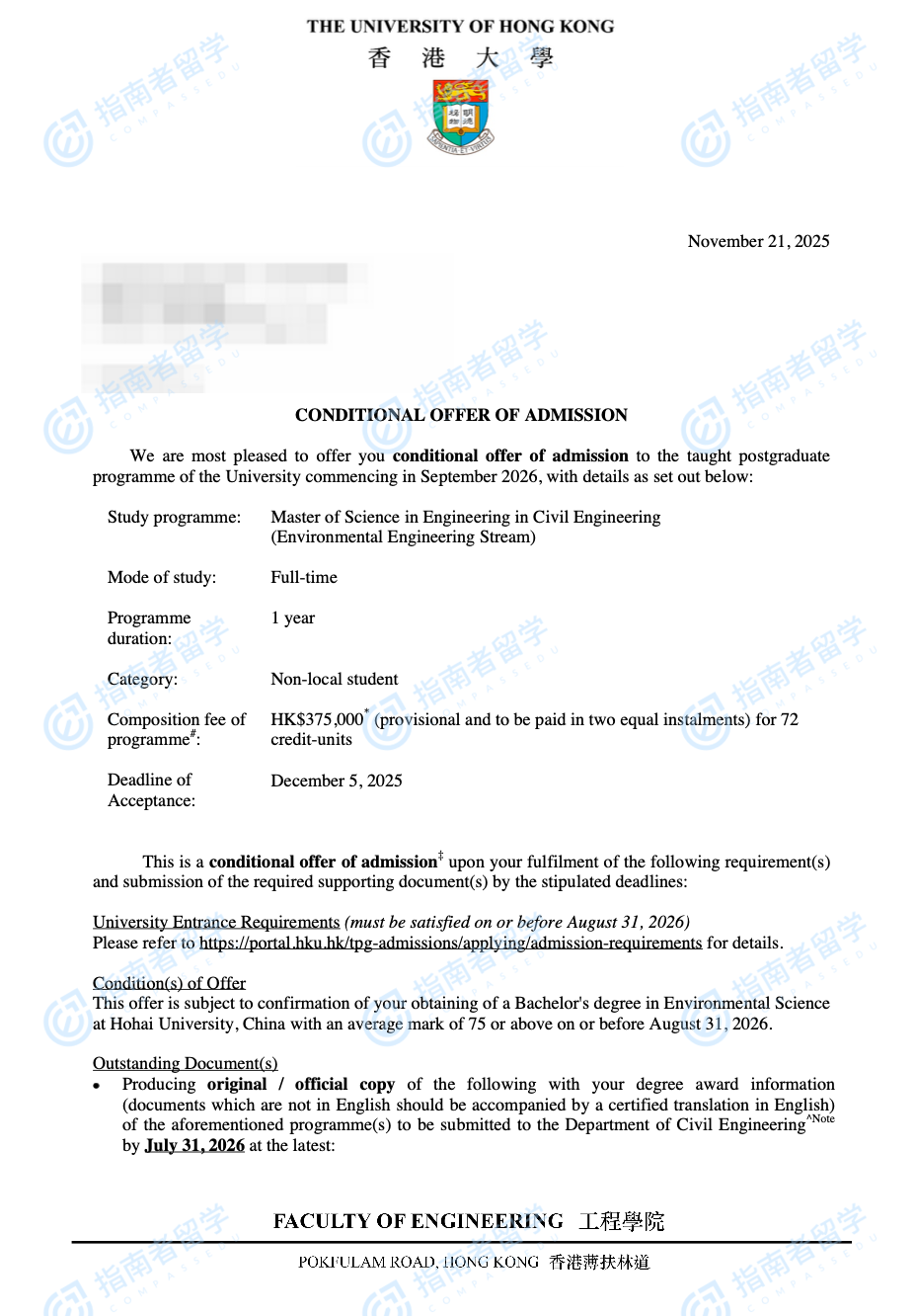 香港大学土木工程(工程)理学硕士 - 环境工程方向研究生offer一枚