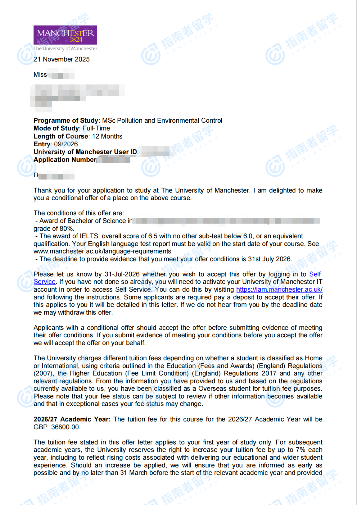 曼彻斯特大学污染与环境控制理学硕士研究生offer一枚