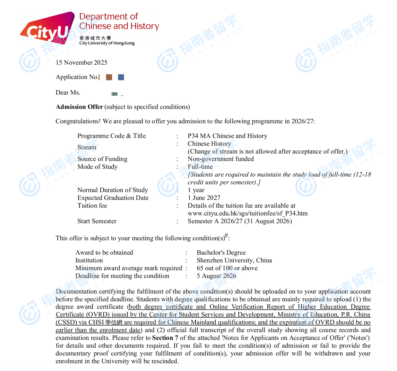 香港城市大学中国语言文学与历史文学硕士研究生offer一枚