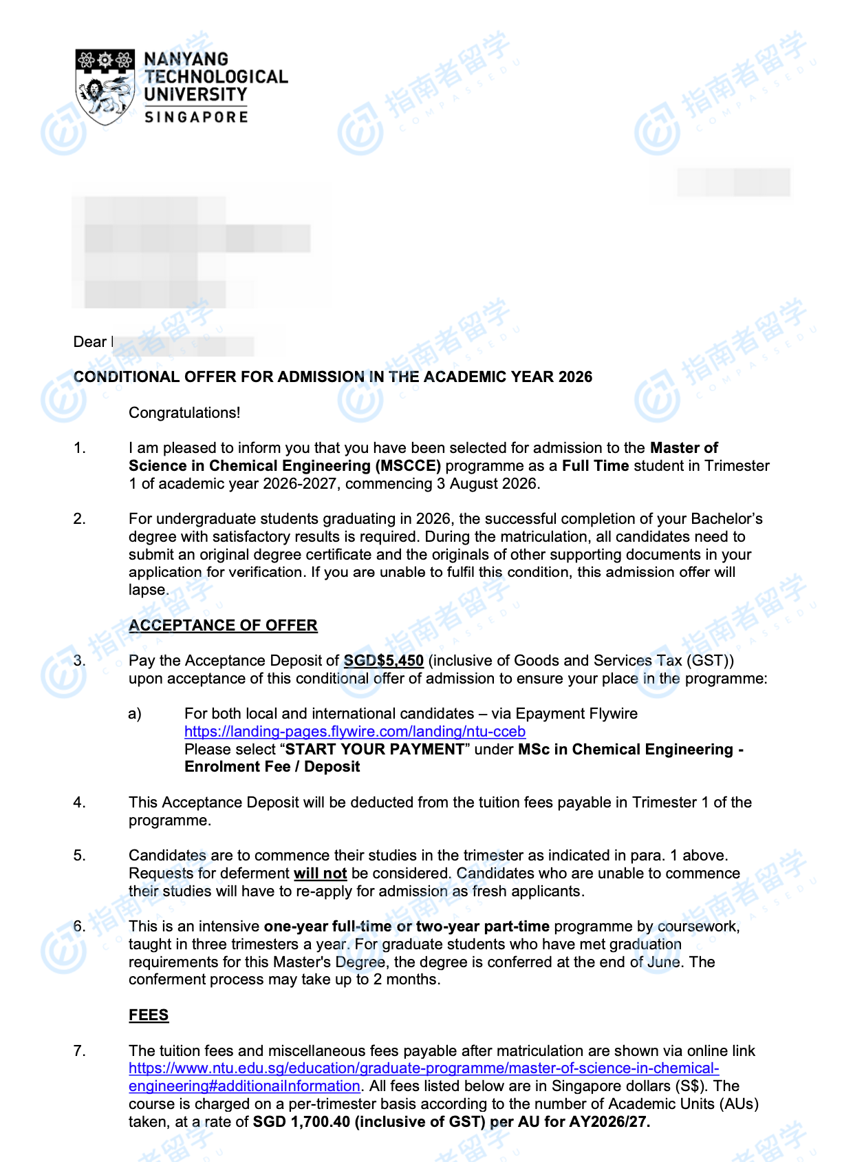 南洋理工大学化学工程理学硕士研究生offer一枚