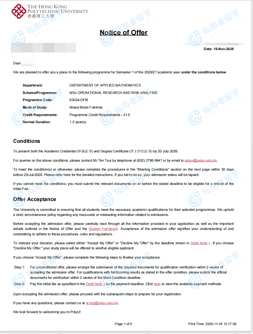 香港理工大学运筹及风险分析理学硕士研究生offer一枚