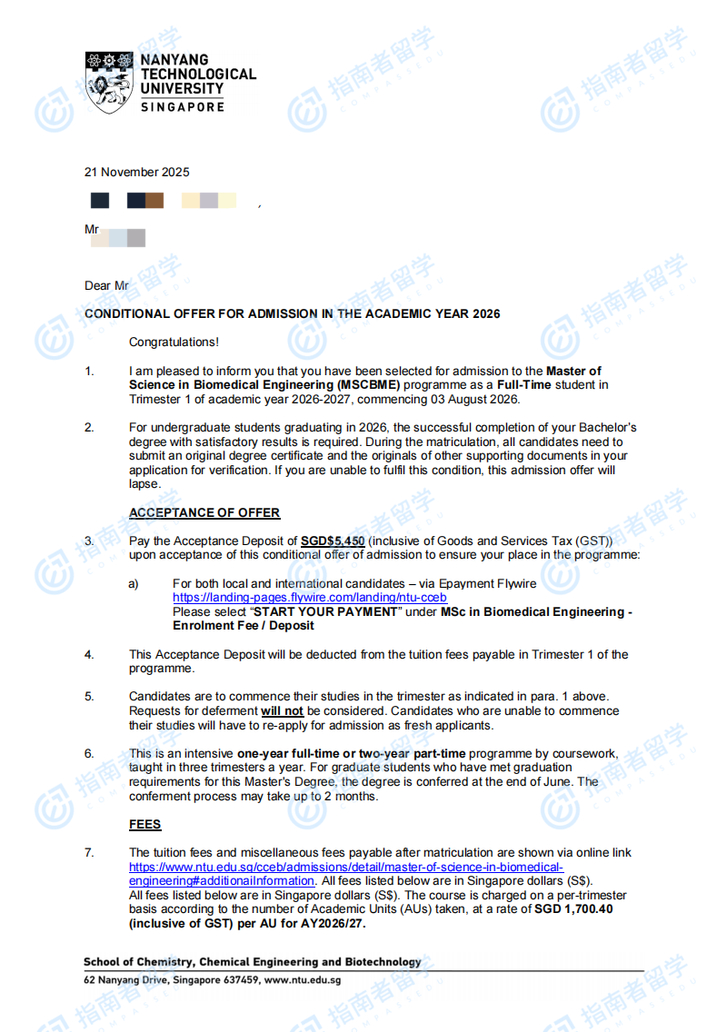 南洋理工大学生物医学工程理学硕士研究生offer一枚