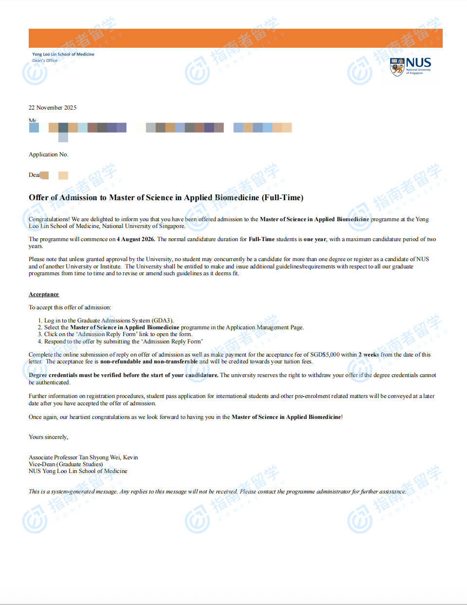 新加坡国立大学应用生物医学理学硕士研究生offer一枚