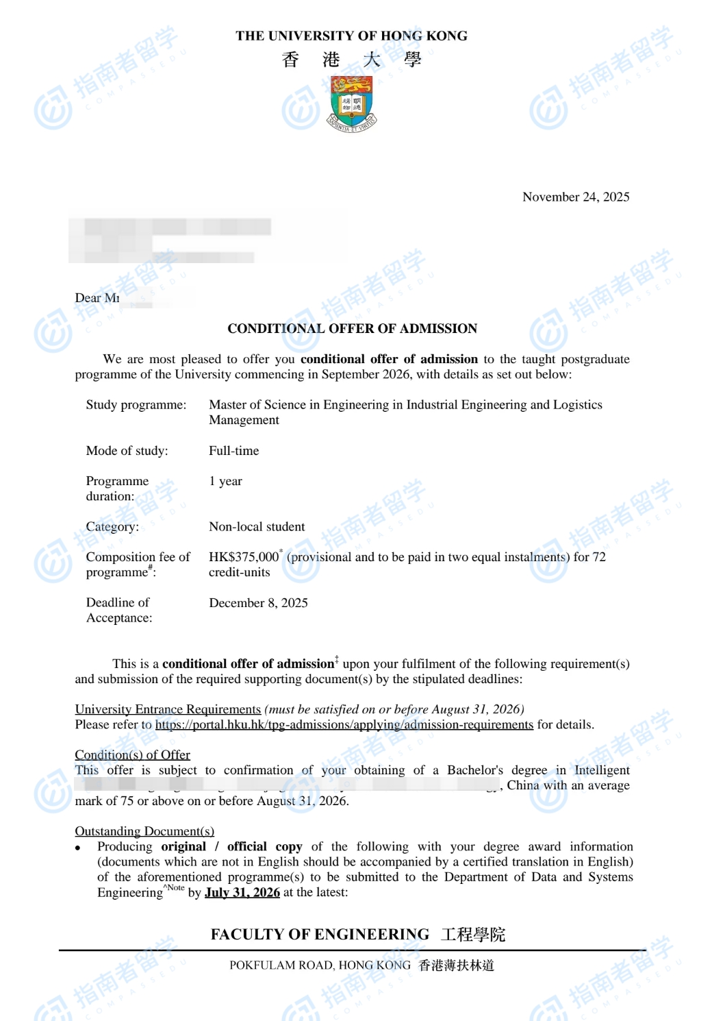 香港大学工业工程与物流管理(工程)理学硕士研究生offer一枚