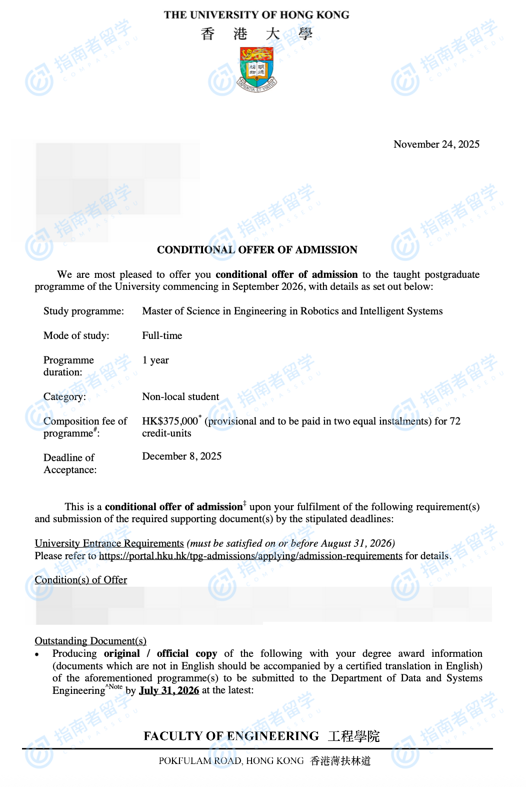 香港大学机器人与智能系统(工程)理学硕士研究生offer一枚