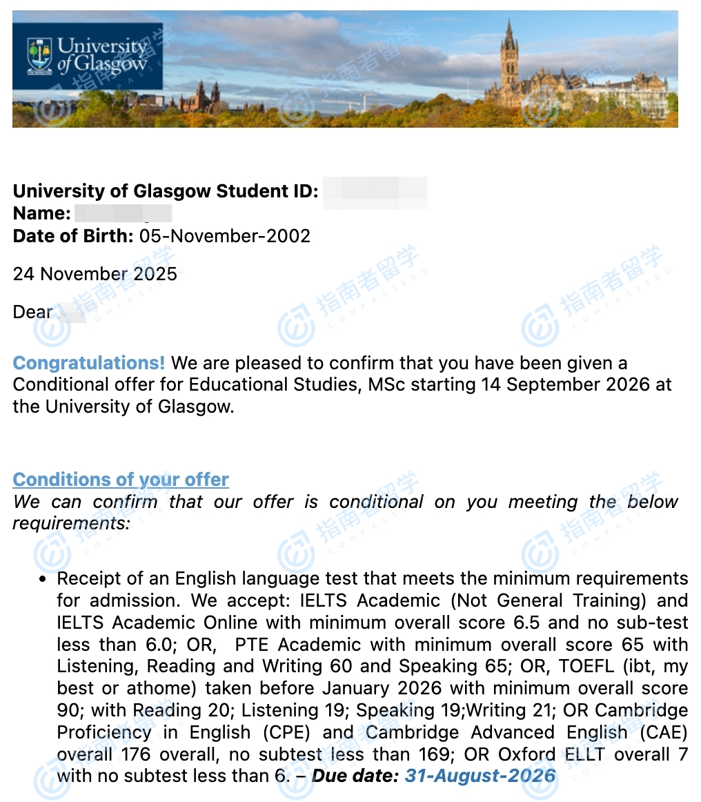 格拉斯哥大学教育学研究理学硕士研究生offer一枚