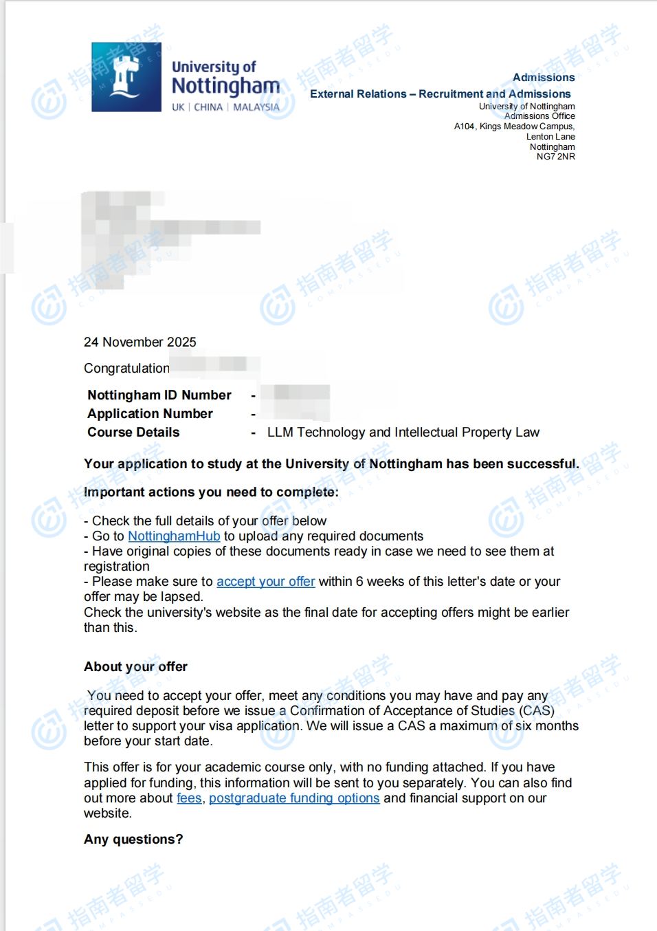 诺丁汉大学技术与知识产权法法学硕士研究生offer一枚