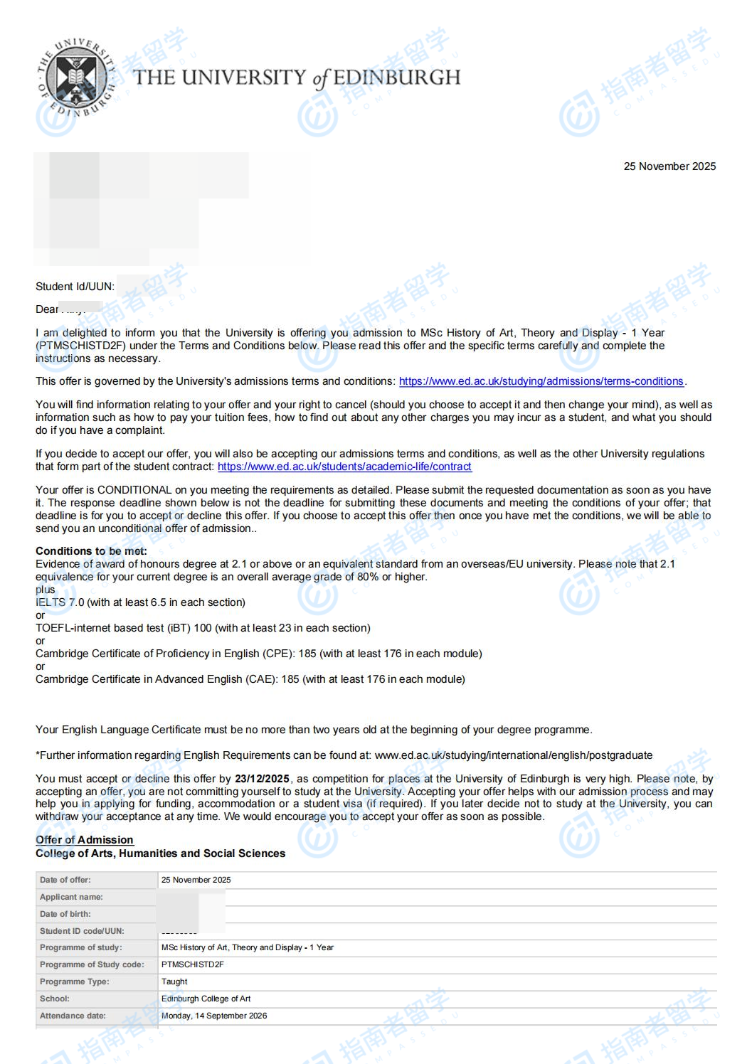 爱丁堡大学艺术史、理论与展览理学硕士研究生offer一枚