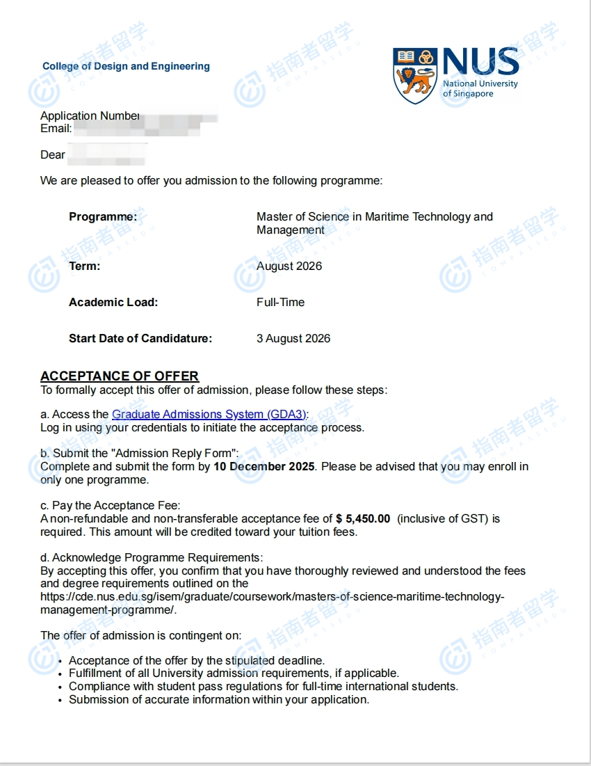 新加坡国立大学海事技术与管理理学硕士研究生offer一枚