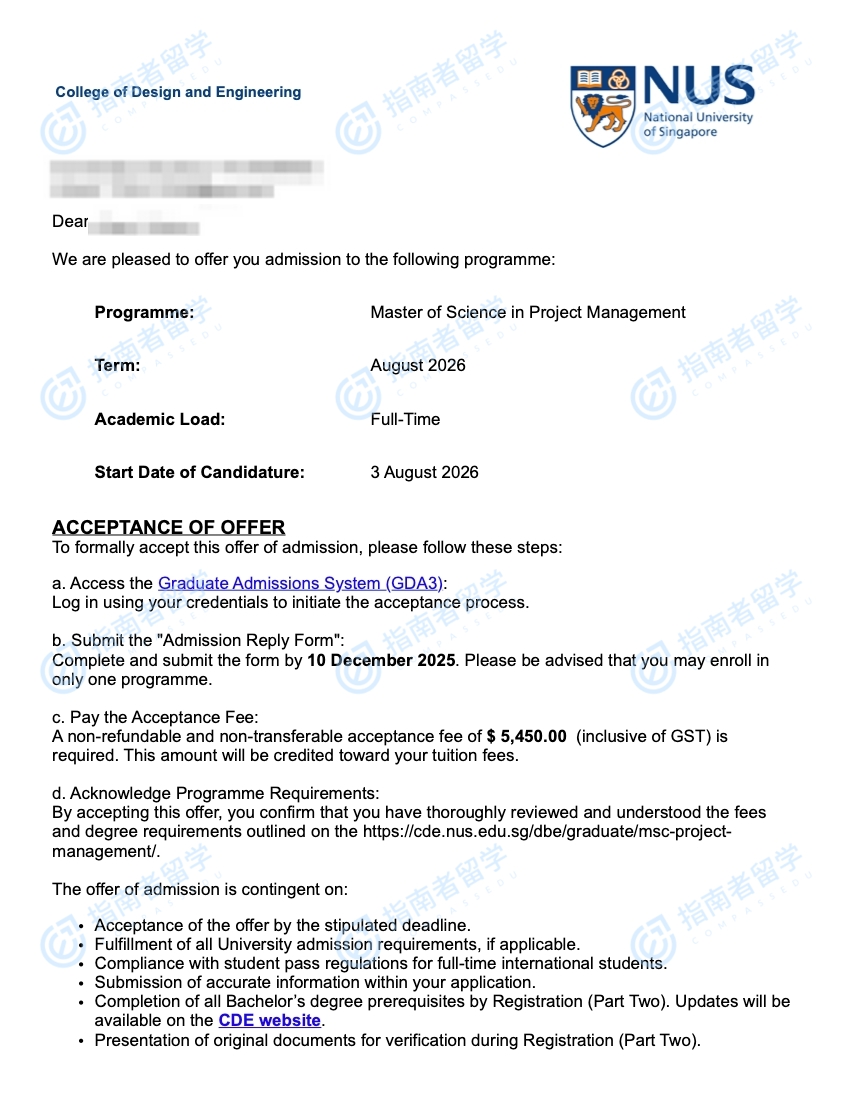 新加坡国立大学项目管理理学硕士研究生offer一枚
