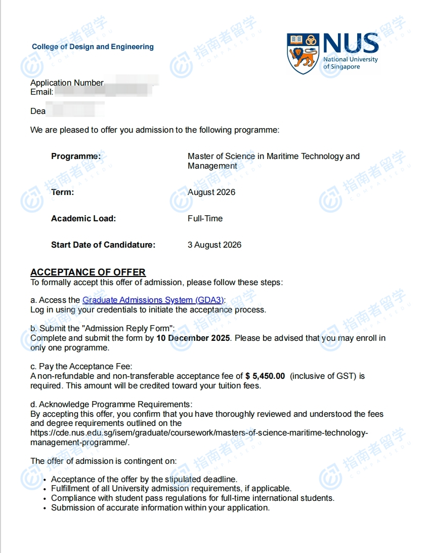 新加坡国立大学海事技术与管理理学硕士研究生offer一枚