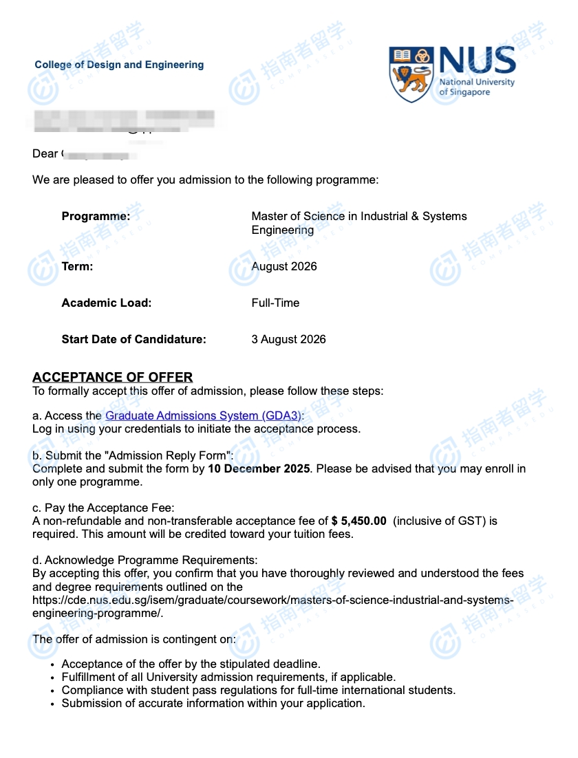 新加坡国立大学工业与系统工程理学硕士研究生offer一枚