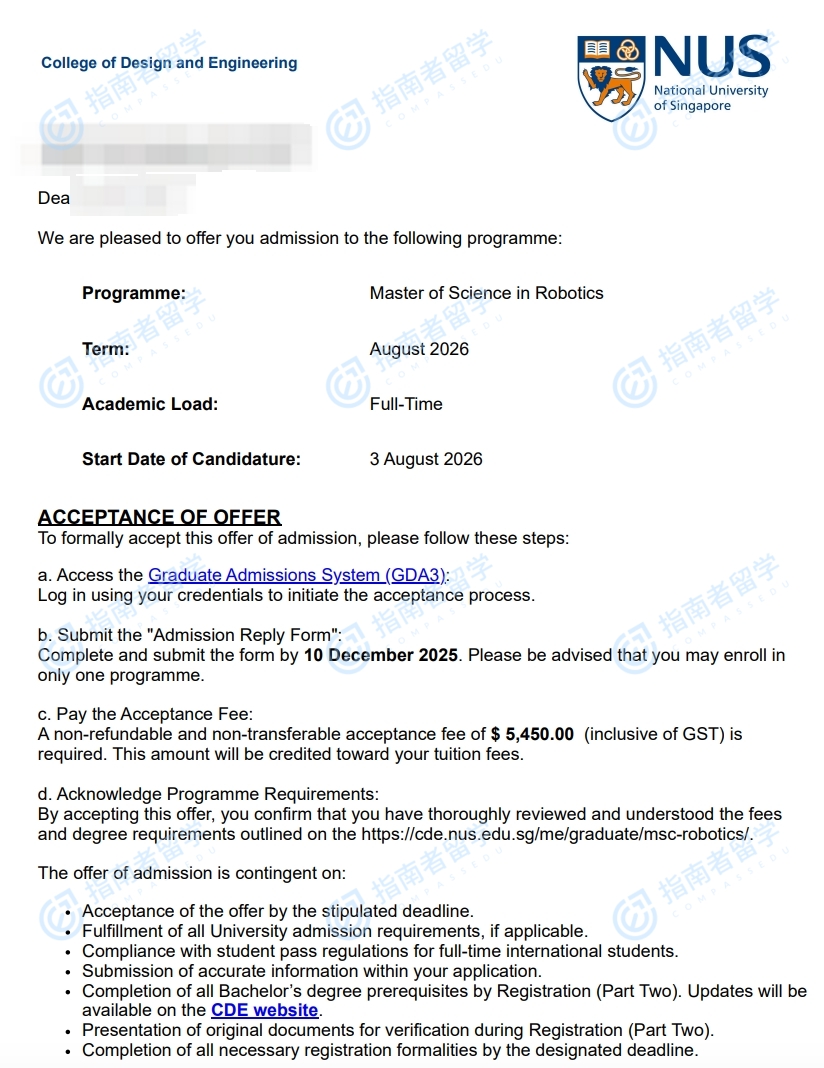 新加坡国立大学机器人学理学硕士研究生offer一枚