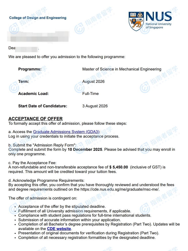 新加坡国立大学机械工程理学硕士研究生offer一枚