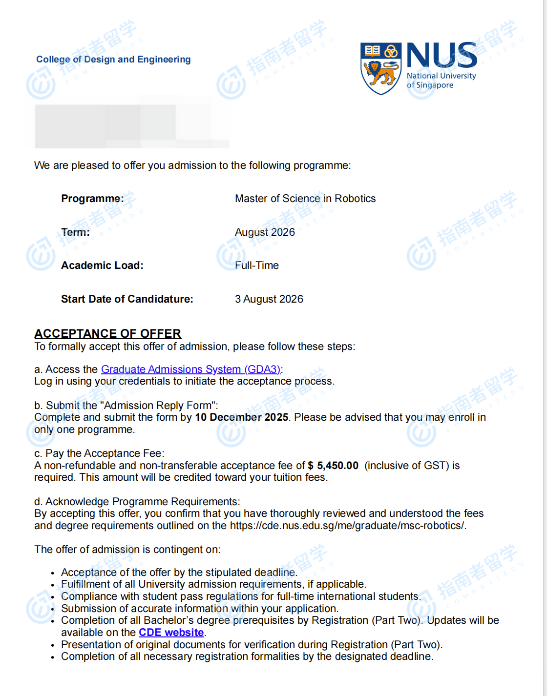 新加坡国立大学机器人学理学硕士研究生offer一枚