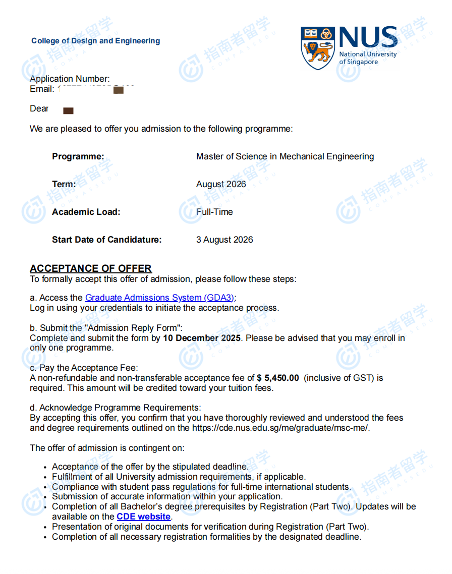 新加坡国立大学机械工程理学硕士研究生offer一枚